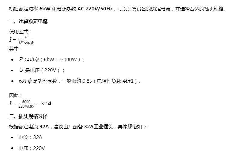 電源:AC220 V/50 Hz,額定功率 6 kW,出廠配 多少 A 插頭